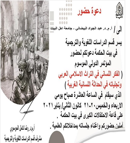 بخطوة مباركة مثل الاستاذ المساعد الدكتور عبد الجواد الببضاني جامعة أهل البيت في المؤتمر الدولي    المنعقد في بغداد للمدة من ٢٠ - ٢١ من الشهر الجاري  تحت عنوان  ( الفكر اللساني في التراث الاسلامي العربي و تجلياته في الفكر الغربي ) و قد ساهم الدكتور البيضاني ببحثه الموسوم ( تشومسكي بين النحو التقليدي و النحو التوليدي) وقد حاز  البحث على المرتبة المتقدمة من بين البحوث المطروحة في المؤتمر .