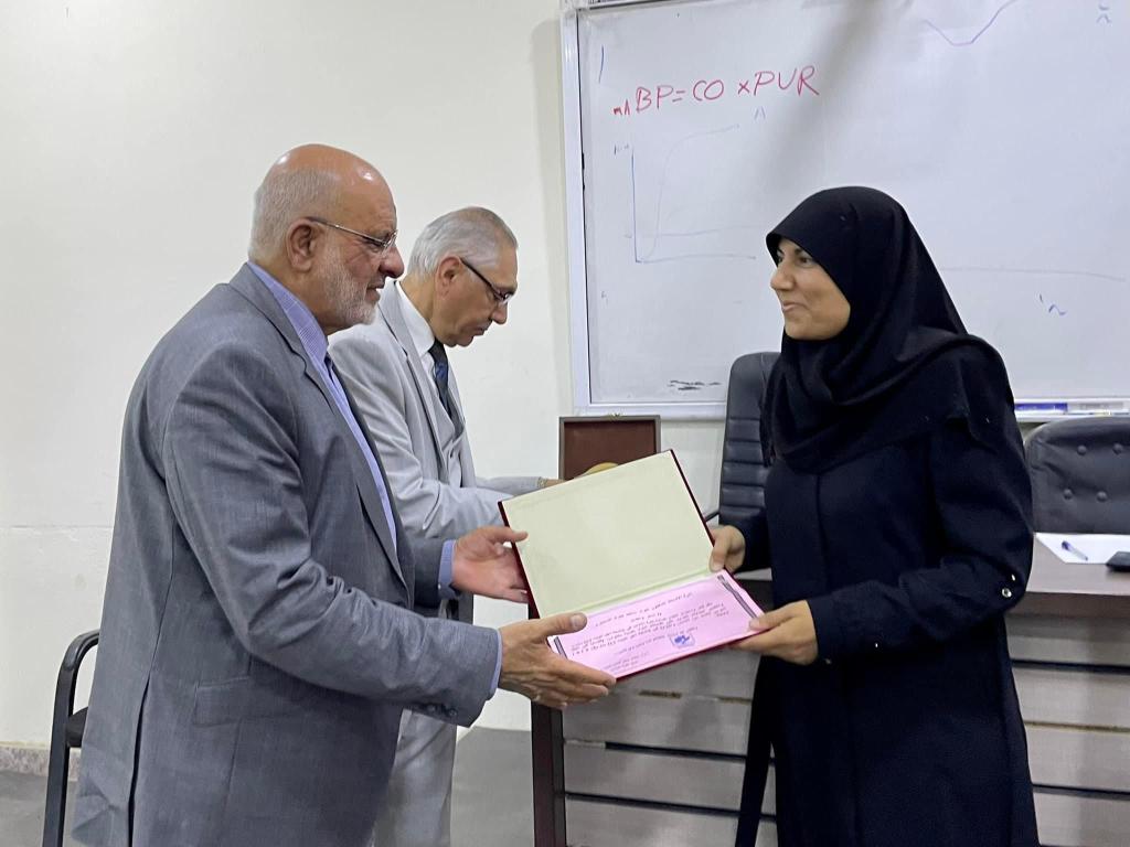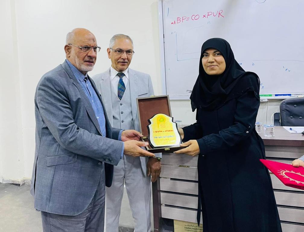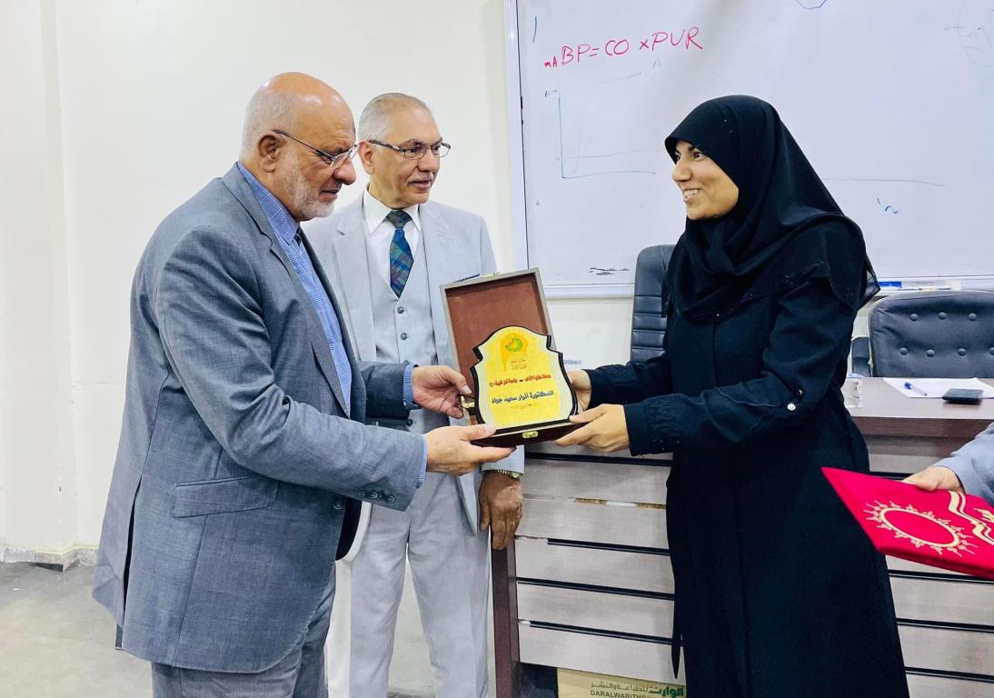 وفي النهاية قدم السيد رئيس الجامعة كتاب شكر وتقدير مصحوب بدرع الجامعة تثمينا للجهود التي بذلتها الدكتورة