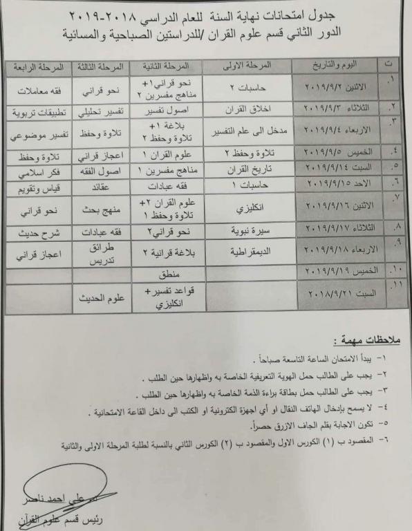 Welcome الرئيسية كلية العلوم الاسلامية قسم علوم القرآن والتربية الاسلامية قسم علوم القرآن والتربية الإسلامية جدول الامتحانات النهائيه الدور الثاني لقسم علوم القرأن للعام الدراسي 2018-2019 sabah@itc