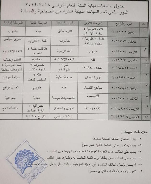 جدول الامتحانات النهائيه الدور الثاني لقسم السياحه الدينيه للعام الدراسي 2018-2019