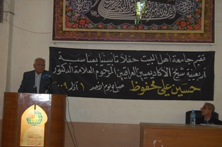أقامت جامعة أهل البيت (عليهم السلام) حفلاً تأبينياً بمناسبة مرور أربعين يوماً على وفاة العلامة الأستاذ الدكتور حسين علي محفوظ (رحمة الله) في الساعة العاشرة من صباح يوم الأحد ثالث أيام شهر ربيع الأول 1430هـ الموافق 1 آذار 2009م حضره جمع من الأدباء و المثقفين. بدأ الحفل بتلاوة آيات كريمة من الكتاب العزيز رتلها السيد علي القزويني ثمَّ نهض المحتفلون لقراءة سورة الفاتحة وقوفاً على روح الفقيد العزيز و على أرواح علماء المسلمين. ألقى بعد ذلك رئيس الجامعة الأستاذ الدكتور عبود جودي الحلي كلمةً رحب بها بالحاضرين و شكر تجشمهم عناء حضور الاحتفال و جاءَ في كلمتهِ أنّ الاحتفال بذكرى مرور أربيعين يوماً على وفاة العلامة العراقي العربي المسلم المرحوم الأستاذ الدكتور حسين علي محفوظ هو احتفالٌ بأعلام العراق الذين كانوا – ولازالوا - شموعاً تتوهج لتمزق ظلام التخلف و الجهل. و عندما ارتقى الدكتور عدنان محمد آل طعمة عميد كلية الآداب في جامعة أهل البيت سرد بعض ذكرياته مع الفقيد عندما كان يلتقيه في القاهرة و بغداد و كربلاء و ذكر أن الراحل الفقيد كان لا يكتفي بحضور الاجتماعات العلمية و زيارة المؤسسات الأكاديمية و إنما يتابع النشاطات الفنية وقد حضر فعلاً مسرحيات: شاهد ماشفش حاجة, و مدرسة المشاغبين، و العيال كبرت.. و أنشد الشاعر رضا كاظم الخفاجي قصيدة بالمناسبة جاء فيها قوله: