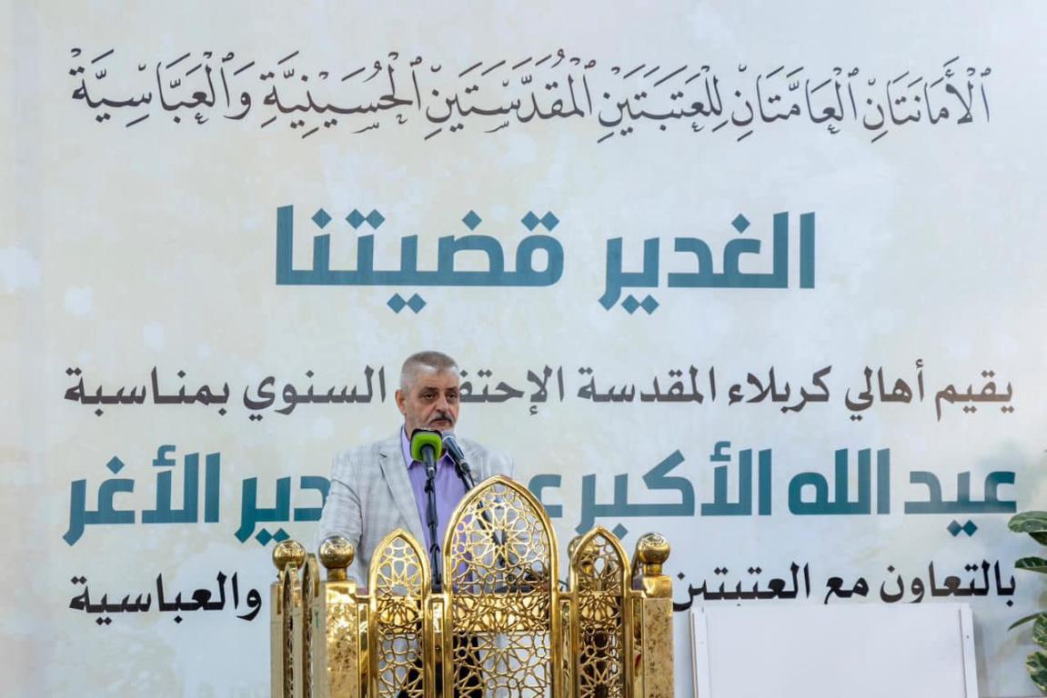 برعاية الأمانتين العامتين للعتبتين المقدستين الحسينية والعباسية وبمناسبة عيد الغدير الأغر أقام أهالي كربلاء المقدسة احتفالهم السنوي في رحاب العتبة العباسية المقدسة وبحضور ممثلي العتبتين المقدستين وجمع من الحضور الكريم من مختلف محافظات العراق وتم انتخاب الأستاذ حيدر المعمار مدير قسم النشاطات الطلابية في الجامعة لإلقاء كلمة اهالي كربلاء المقدسة على مسامع الحضور حيث قدم في مستهل كلمته الشكر الجزيل للمتوليين الشرعيين للعتبتين الحسينية والعباسية المقدستين على دعمهم المتواصل لإحياء الشعائر والمناسبات الدينية المختلفة كما وأعلن عن استعداد المحافظة بكافة مؤسساتها الحكومية والاهلية ومواطنيها لاستقبال الزائرين الكرام وفي مختلف المناسبات الدينية ..