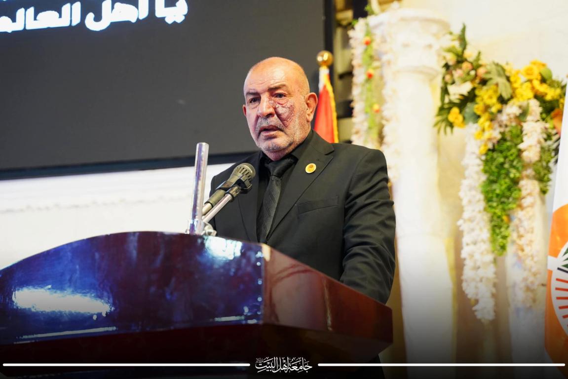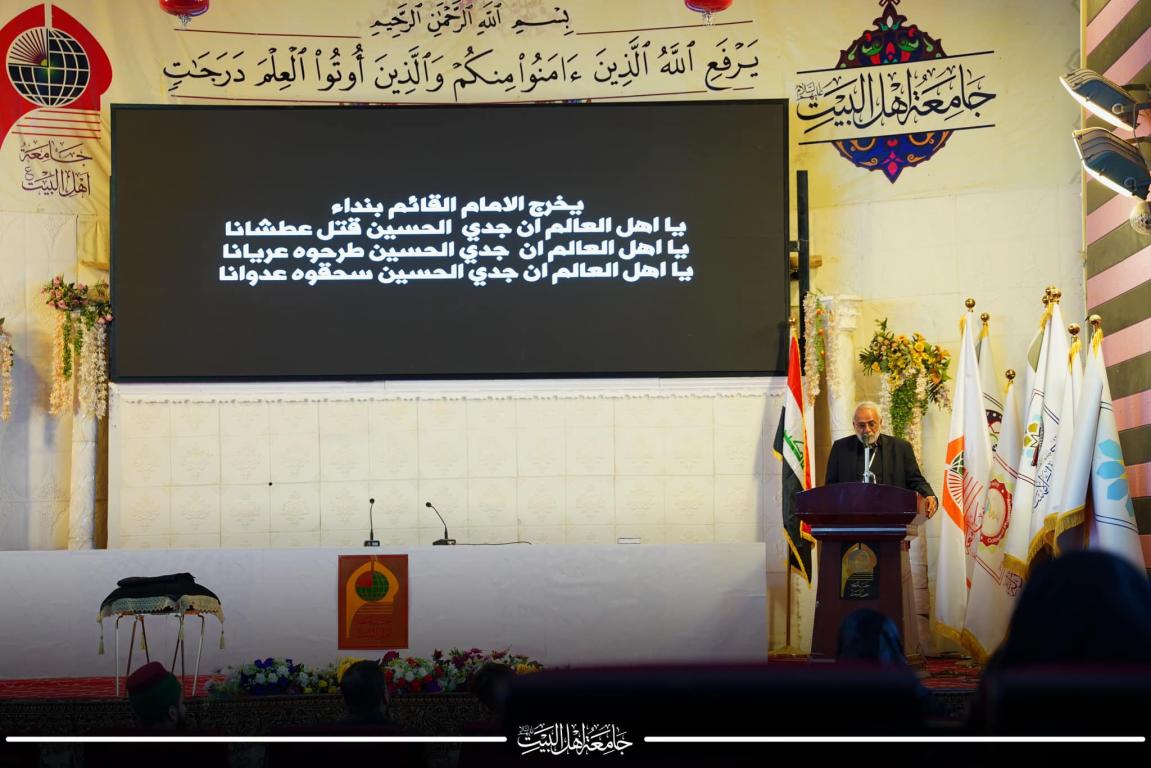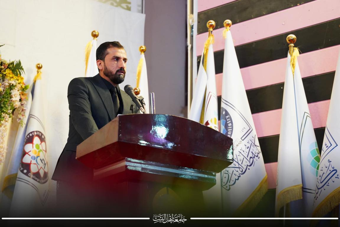 بعدها القى الاستاذ حسنين الانباري ممثل سماحة الامين العام كلمة شكر فيها كل القائمين على جامعة اهل البيت عليهم السلام وكيف دأبت العتبة الحسينية المقدسة على ضرورة الاستمرار وديمومة شعيرة رفع الراية المباركة في معظم كليات وجامعات العراق