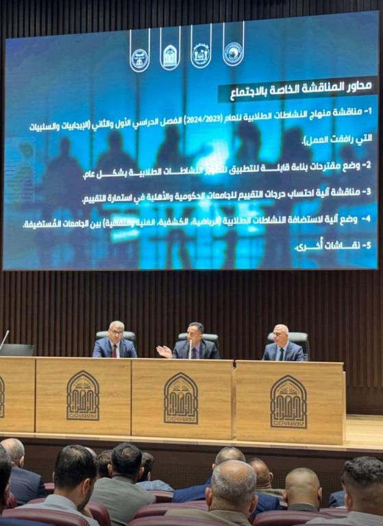 بحضور الاستاذ الدكتور عمار الزبيدي مدير قسم النشاطات الطلابية في جهاز الإشراف والتقويم العلمي والأستاذ الدكتور نعمان الخزرجي مدير إعلام القسم والأستاذ الدكتور فراس الكناني مسؤول اللجنه الثقافية والفنية تم عقد اجتماع مدراء أقسام وشعب النشاطات الطلابية للجامعات والكليات الحكومية والأهلية في رحاب جامعة الزهراء للبنات للمدة من 25 - 26 / 9 / 2024 وبحضور الاستاذ الدكتور زهير المساعد العلمي للجامعة وذلك لمناقشة السلبيات لمنهاج العام الدراسي 2023 - 2024 ومعالجتها ومناقشة المنهاج للعام الدراسي 2024 - 2025 وتطويره وكذلك تمت مناقشة آلية استضافة النشاطات الطلابية للعام الدراسي الحالي ..