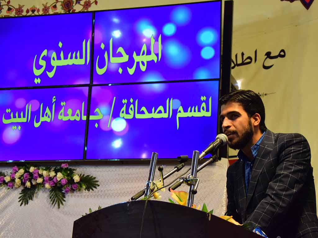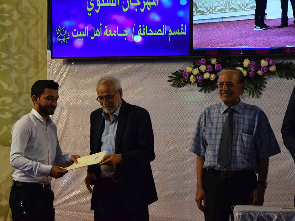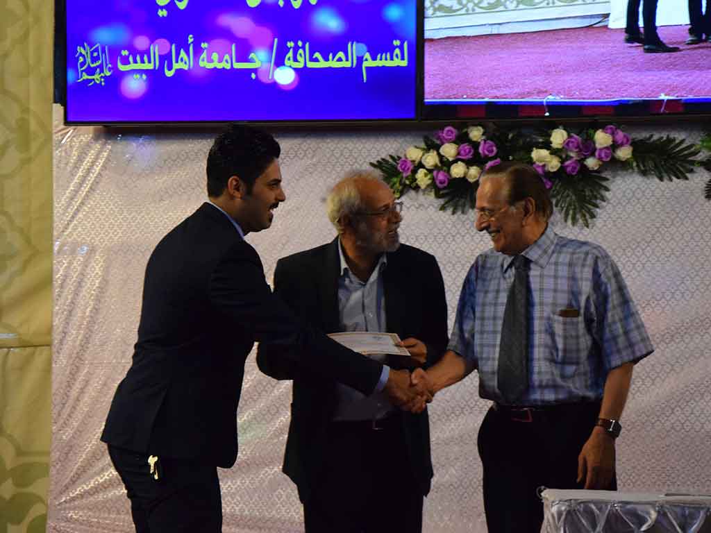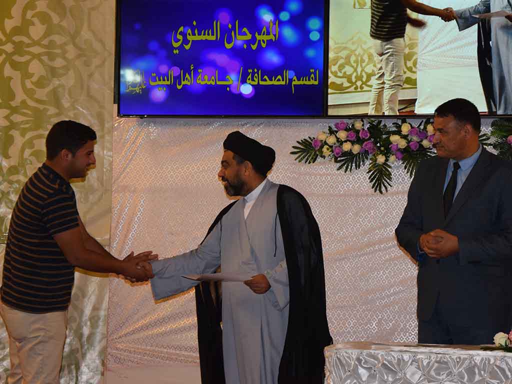 برعاية الدكتور محسن القزويني مؤسس جامعة أهل البيت (ع) أقام قسم الصحافة اليوم السبت مهرجانه السنوي الذي شمل تقديم عرض مفصل من قبل رئيس قسم الصحافة بشأن نشاطات قسم الصحافة للموسم الدراسي 2016- 2017 والتي شملت إنتاج أفلام تسجيلية منها فلم (جامعة العطاء) الذي حاز على الجائزة الأولى كأحسن مشروع تخرج، وتقارير تلفزيونية متنوعة أعدها الطلبة أنفسهم بدعم وتوجيه من التدريسيين.