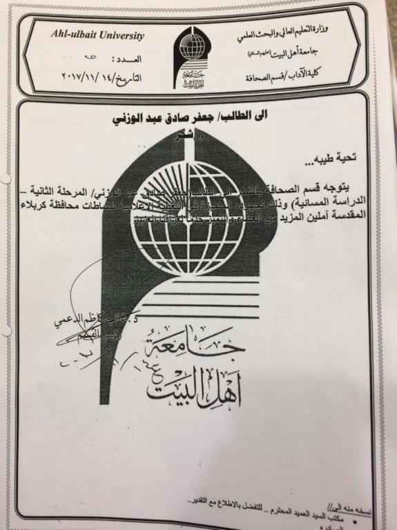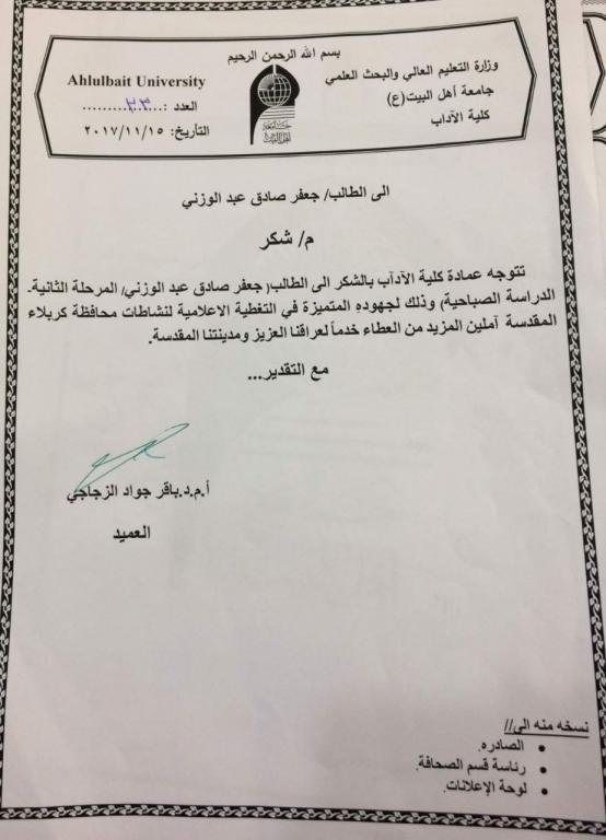 كرم عميد كلية الاداب في جامعة اهل البيت عليهم السلام الدكتور باقر الزجاجي الطالب جعفر الوزني المراسل الخاص بصحيفة اصوات الالكترونية التابعة لقسم الصحافة في جامعة اهل البيت عليهم السلام هذا و قام رئيس قسم الصحافة في الجامعة الدكتور غالب الدعمي بتكريم الطالب ايضا لدوره الفعال في الصحيفة في تغطية مراسيم زيارة الاربعين بشكل مستمر و اثنى على دوره المتميز ومن الجدير بالذكر ان صحيفة اصوات الالكترونية حصلت على كتاب شكر وتقدير من دائرة صحة كربلاء لمساهمتها الفعالة في نقل الاخبار التي تخص مدينة كربلاء خلال الزيارة الاربعينية