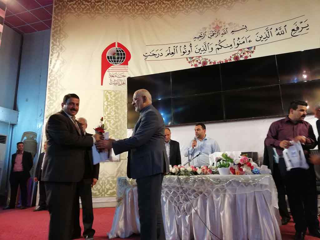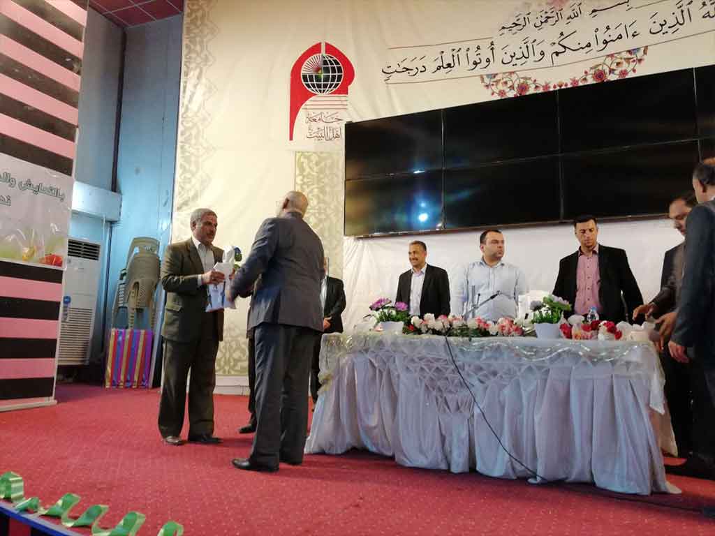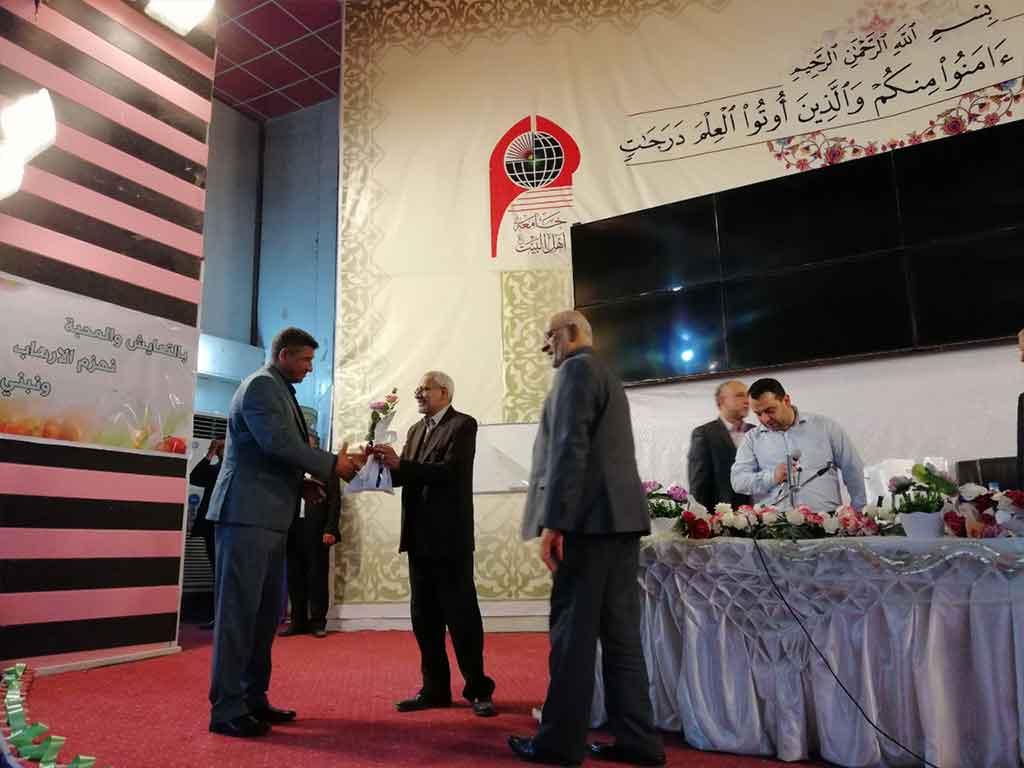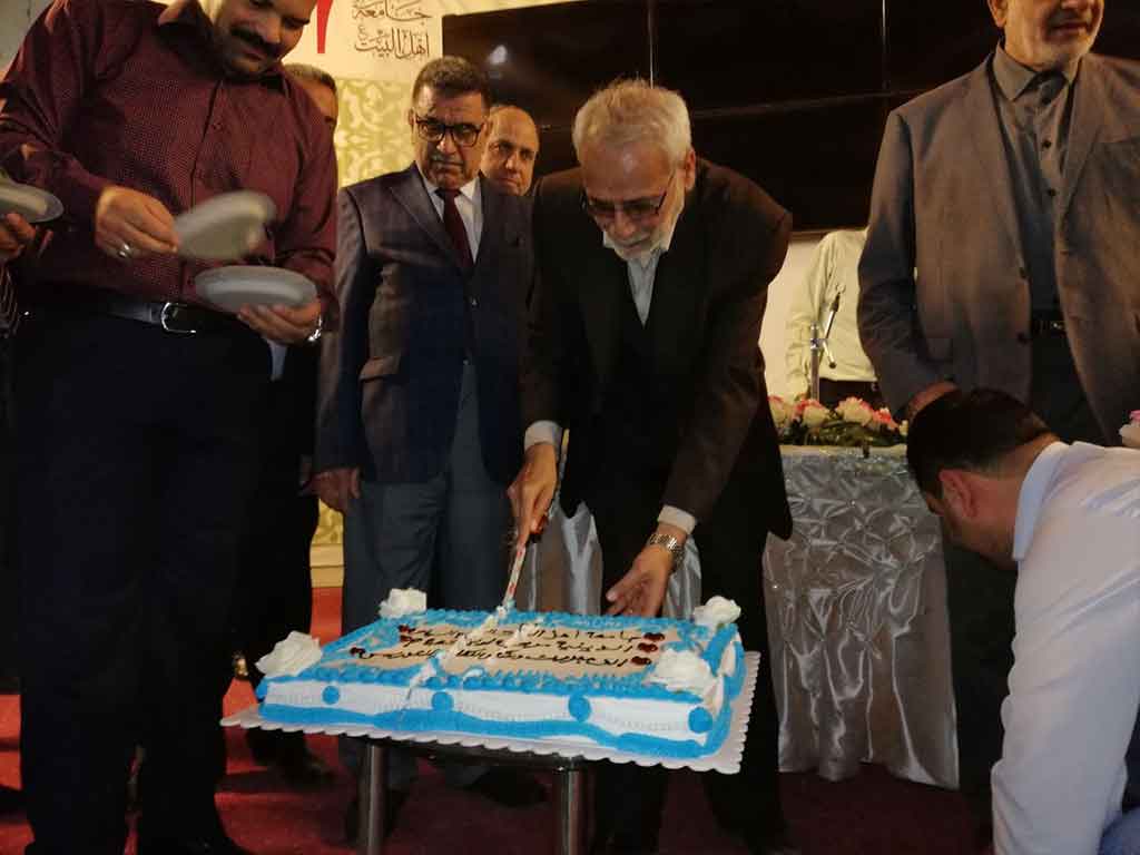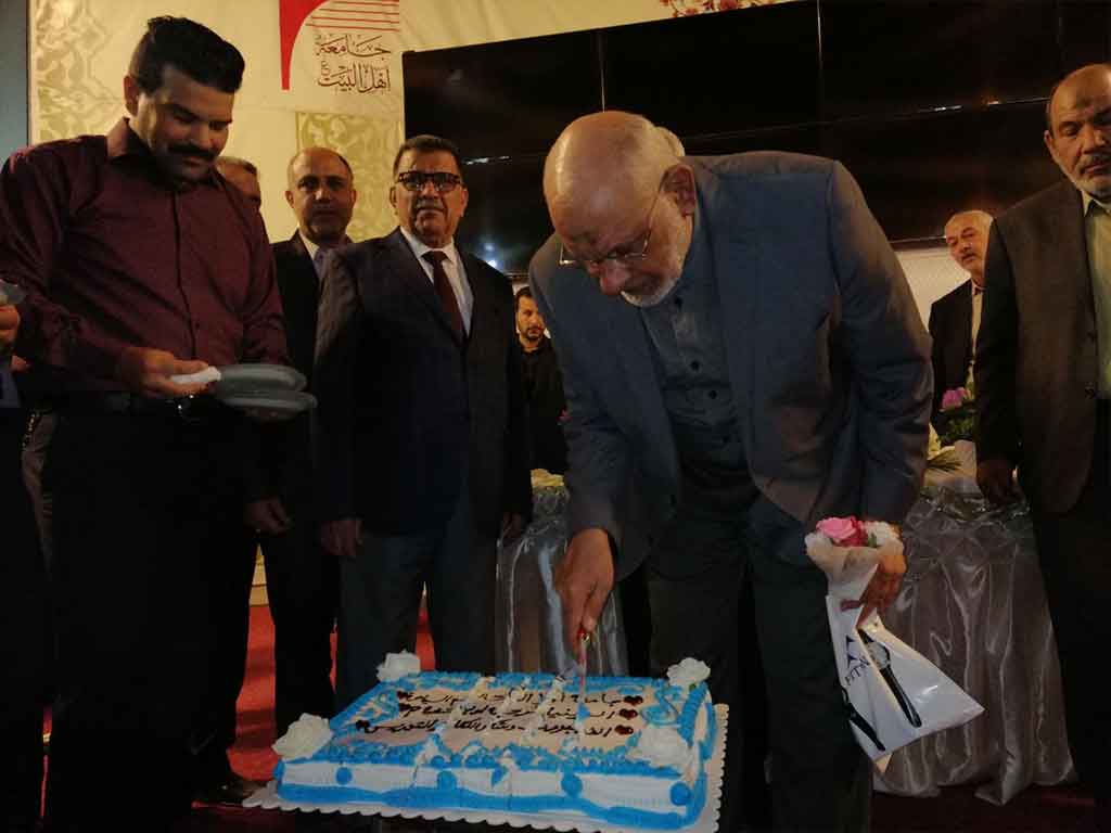 احتفلت كلية العلوم الاسلامية قسم السياحة الدينية بعيد المعلم وحضر الاحتفالية مؤسس جامعة اهل البيت عليهم السلام الدكتور محسن القزويني وعميد كلية العلوم الاسلامية الدكتور عبد الحميد النجدي ومعاون العميد وعدد من التدريسين في القسم وعدد خفير من الطلبة وافتتح الاحتفال بقراءة اي من الذكر الحكيم والوقوف لقراءة سورة المباركة الفاتحة على ارواح شهداء الوطن من القوات الأمنية والحشد الشعبي والقى عميد الكلية ومؤسس الجامعة كلمة بحق المعلم و الاستاذ الجامعي و دوره البارز في بناء المجتمع و في الختام وزع الدكتور محسن القزويني الهدايا على الاساتذة بالنيابة عن الطلبة و كرم عميد الكلية مؤسس الجامعة بهذه المناسبة و تقدم له بالشكر و العرفان على الدعم و التعاون المستمر المقدم من قبل الهيأة المؤسسة لانجاح المسيرة العلمية في الجامعة