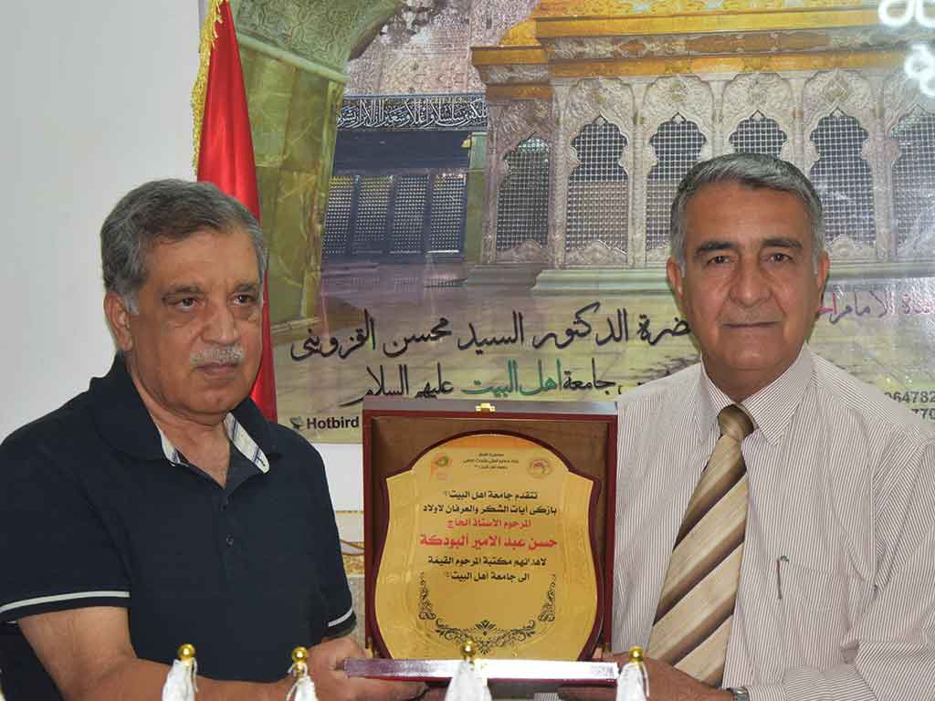 تبرع اولاد المرحوم الحاج حسن عبد الامير ابودكة بمكتبة والدهم الخاصة الى جامعة اهل البيت عليهم السلام حيث زار الجامعة اولاد المرحوم كل من الاستاذ فلاح حسن ابودكة و الاستاذ صباح حسن ابودكة و قد رحب بهم مؤسس جامعة اهل البيت عليهم السلام الدكتور محسن القزويني وعميد كلية العلوم الاسلامية الدكتور حميد النجدي و مدير الاعلام والعلاقات الاستاذ صادق القزويني و اكد اولاد المرحوم على ان جامعة اهل البيت عليهم السلام هي المكان الانسب لهذه المكتبة القيمة لما تلعبه الجامعة من دور كبير في تطوير الواقع العلمي في العراق و لما لها من تاريخ مشرف في مجال التعليم العالي و البحث العلمي و اشاد الدكتور القزويني بأن الجامعة ترحب بفكرة اهداء المكتبات الخاصة حرصا عليها من الاندثار و بين ان هذه المكتبات تحتوي على الكتب القيمة التي من شأنها ان تساعد الطلاب في عمليتهم الدراسية واجراء الابحاث كما اوضح ان مكتبة جامعة اهل البيت عليهم السلام تستقبل كافة الطلبة من انحاء العراق الذين يبحثون عن الكتب النادرة في الاختصاصات كافة و في الختام كرم رئيس جامعة اهل البيت عليهم السلام الاستاذ الدكتور صاحب الاطرقجي اولاد المرحوم الحاج حسن عبد الامير ابودكة بدرع الجامعة و تقدم لهم بالشكر على هذه الخطوة المباركة كما كرمهم الدكتور القزويني بوسام الجامعة للتميز