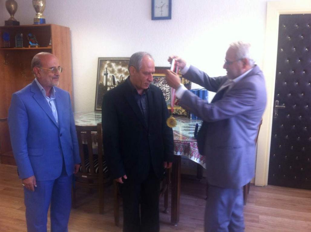 وفي نهاية الاجتماع قلد موسس الجامعة الدكتور محسن القزويني رئيس جامعة خوارزمي وسام  جامعة اهل البيت عليهم السلام