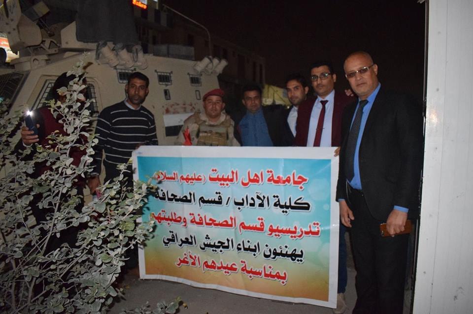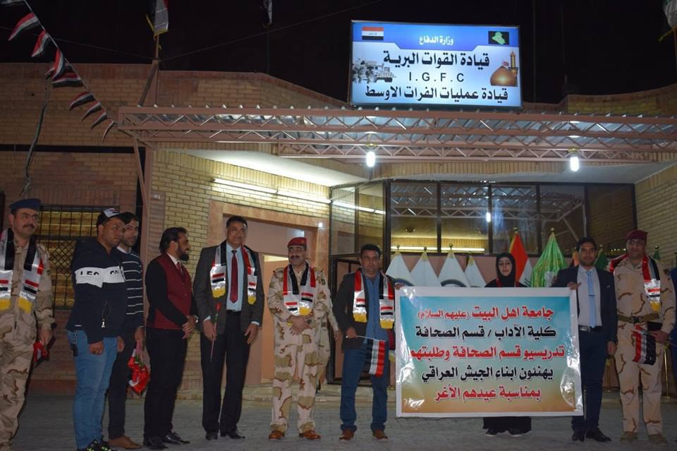 هنأ طلبة قسم الصحافة في جامعة أهل البيت في محافظة كربلاء المقدسة الجيش العراقي بمناسبة عيدهم الأغر، وقاموا بتوزيع العلم العراقي على ابطال الجيش العراقي في محافظة كربلاء ونثر الحلوى على رؤوسهم احتفالاً بمناسبة عيدهم الاغر.