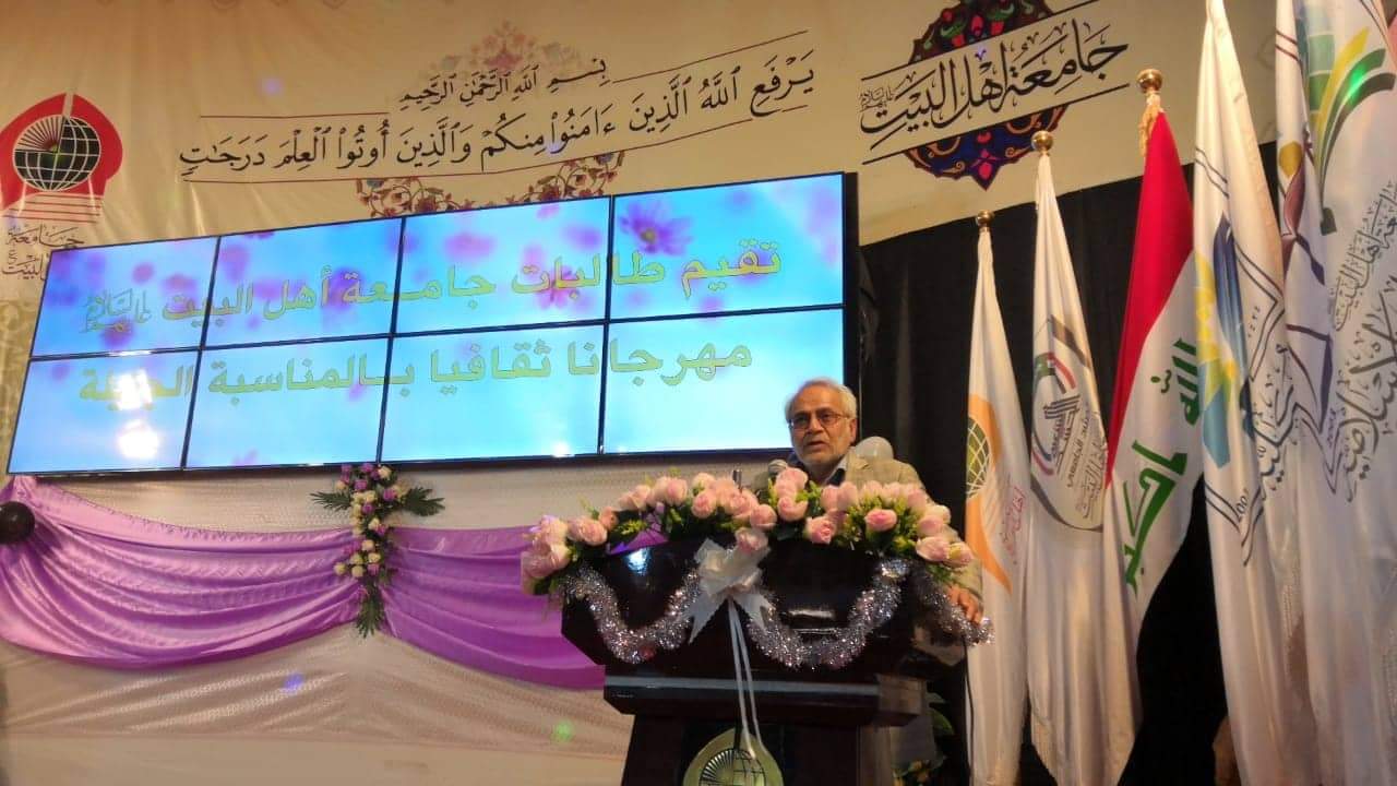 اقامت جامعة اهل البيت عليهم السلام حفلا للطالبات بمناسبة مولد سيدة نساء العالمين فاطمة الزهراء عليها السلام على قاعة الجامعة الكبرى و بحضور مؤسس الجامعة الدكتور محسن القزويني و رئيس الجامعة الدكتور عباس الحميري و عمداء الكليات و جمع غفير من طالبات الكليات كافة حيث بدء الحفل بقراءة اي من الذكر الحكيم و من ثم الوقوف للاستماع للنشيد الوطني العراقي و قراءة سورة المباركة الفاتحة ترحما على شهداء العراق اجمع بعدها اعتلى المنصة رئيس جامعة أهل البيت عليهم السلام الدكتور عباس الحميري الذي قدم احر التهاني والتبريكات الى الطالبات بهذه المناسبة العطره بعدها كان هناك كلمة لراعي الحفل مؤسس جامعة أهل البيت عليهم السلام الدكتور محسن القزويني الذي بين اهمية المراة في المجتمع في الوقت الحاضر و اكد على اتخاذ سيدة نساء العالمين فاطمة الزهراء عليها السلام قدوة للنساء في كل شي هذا و قدم الدكتور القزويني شرحا مفصلا حول حياة فاطمة الزهراء عليها السلام و اهم صفاتها التي يجب ان تنعكس على النساء اليوم و بعد ذلك بدأت مراسيم الاحتفال من اعمال مسرحية و اناشيد دينيةو اشعار بحق هذه السيدة العظيمة بنت رسول الله (ص) قدمتها الطالبات للحضور