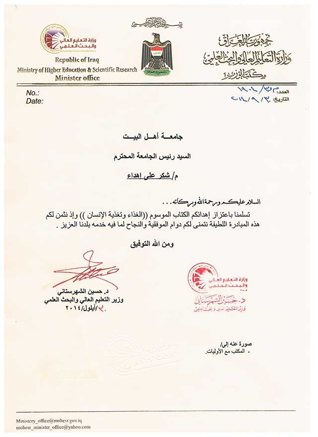 قدّم معالي وزير التعليم العالي والبحث العلمي الدكتور حسين الشهرستاني شكره وتقديره لجامعة أهل البيت عليهم اسلام على الاصدار الجديد الذي تم نشره (الغذاء وتغذية الإنسان) من تأليف الدكتور علي شمخي من أساتذة الجامعة كمادة علمية في قسم السياحة الدينية.