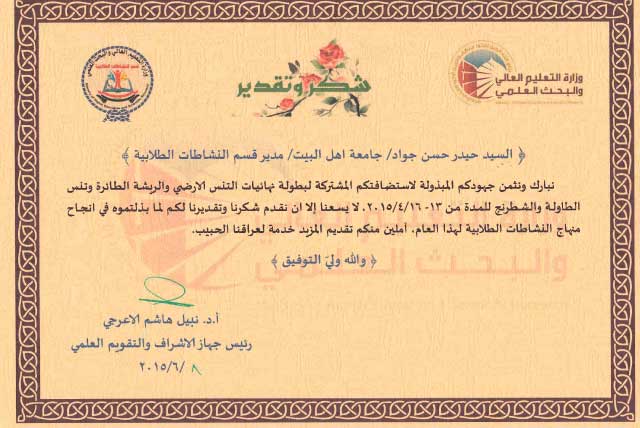 وجه الاستاذ الدكتور نبيل هاشم الاعرجي رئيس جهاز الاشراف و التقويم العلمي شهادة تقدير الى الاستاذ الدكتور صادق عبد المطلب الموسوي رئيس جامعة اهل البيت عليهم السلام و السيد حيدر رئيس قسم النشاط الطلابي في جامعة اهل البيت لجهودهم المبذولة لاستضافة بطولة نهائيات التنس الارضي و الريشة الطائرة و تنس الطاولة و الشطرنج لخدمة تطوير طلبتنا الاعزاء
