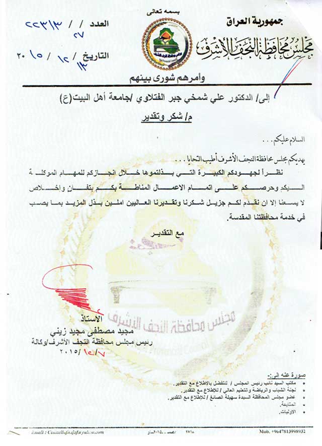 الدكتور علي شمخي التدريسي في قسم الصحافة بجامعة أهل البيت عليهم السلام يتلقى كتاب شكر من السيد رئيس مجلس محافظة النجف الأشرف على القائه محاضرات في الاعلام ضمن الدورة الاعلامية (المراسل الصحفي والمكاتب الاعلامية).