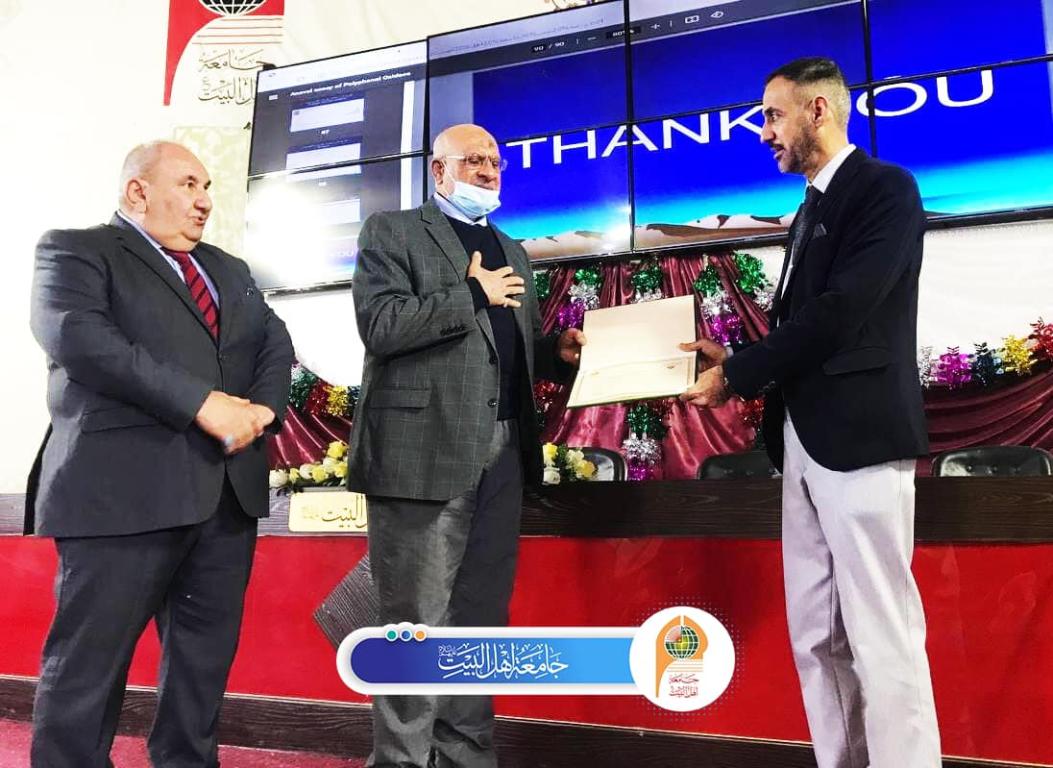 بتوجيه من قبل السيد رئيس جامعة البيت (ع) الا ستاذ الدكتور حميد النجدي المحترم وباشراف السيد مساعد رئيس الجامعة الاستاذ المتمرس الدكتور لبنان هاتف الشامي المحترم نظمت جامعة اهل البيت (ع) "ندوة علمية حضورية بعنوان رصانة النشر العلمي في المجلات العلمية الرصينة حيث قام الاستاذ الدكتور محمود وهدان المحترم الاستاذ في جامعة بابل بالقاء محاضرة بهذا الخصوص وكما تفضلت الدكتورة زينب نعمان المفتي الاستاذة في كلية بغداد للعلوم الاقتصادية الجامعة بالقاء محاضرة حول المجلات العلمية وضوابط النشر . وقد حضر الندوة السيد مؤسس الجامعة الاستاذ الدكتور محسن القزويني والسادة عمداء الكليات ومعاوينهم ورؤساء الاقسام العلمية وكافة اعضاء الهئية التدريسية في الجامعة وفي بداية اللقاء رحب السيد رئيس الجامعة بالمحاضر وجميع الحاضرين وفي ختام الندوة سلم السيد رئيس الجامعة شهادة تقديرية للاستاذ الدكتور محمود هدوان المحترم