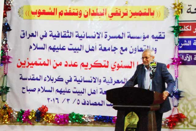 تحت عنوان: (بالتميز ترتقي البلدان وتتقدم الشعوب) أقامت مؤسسة المسرة الانسانية الثقافية في العراق وبالتعاون مع جامعة أهل البيت عليهم السلام في كربلاء المقدسة مهرجانها السنوي لتكريم كوكبة من المبدعين المتميزين في المجالات المعرفية والانسانية وذلك على قاعة جامعة أهل البيت عليهم السلام صباح يوم السبت الموافق الخامس من آذار لعام 2016..