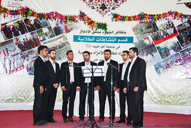 ثم انشدت الفرقة أناشيد باللغة الفارسية بعدها قدم مؤسس الجامعة درع جامعة أهل البيت عليهم السلام وتقدم بكلمة شكر وتقدير للمجهود الذي قدمته الفرقة لإحياء هذا الحفل المبارك.