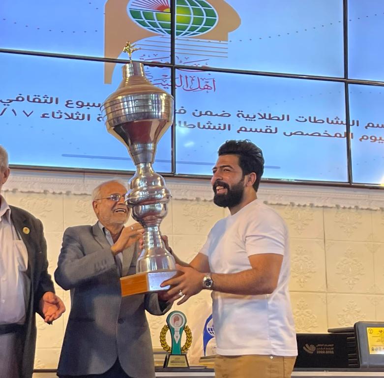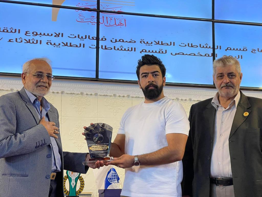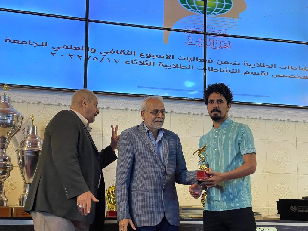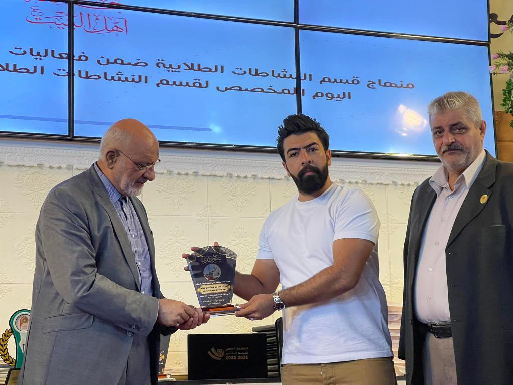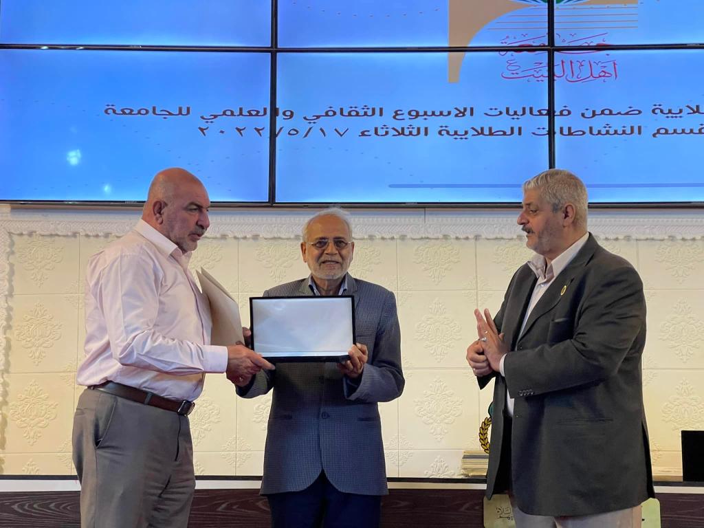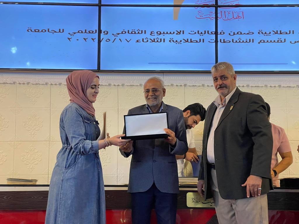 أعقب ذلك تقديم دروع الامتنان من قبل الطلبه إلى الأستاذ الدكتور حميد النجدي رئيس الجامعه والأستاذ الدكتور محسن القزويني مؤسس الجامعه ليتم بعدها تقديم الجوائز والدروع والشهادات التقديرية على الطلبه المشاركين في مختلف النشاطات الطلابية على مدار العام الدراسي