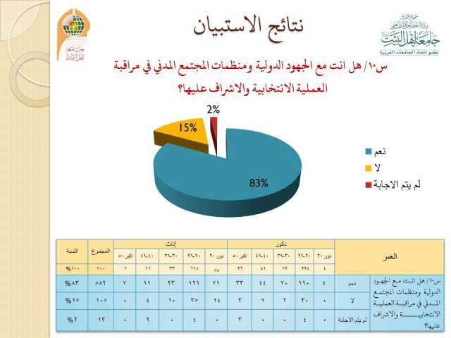 عقد قسم الصحافة والاعلام بكلية الآداب في جامعة أهل البيت عليهم السلام مؤتمراً صحفياً حضره مراسلو وكالات الأنباء والصحف والقنوات الفضائية والاذاعات في الساعة العاشرة والنصف من صباح يوم السبت الموافق 30 آذار 2013 أعلنت خلاله نتائج الاستبيان الذي استطلعت فيه آراء الرأي العام ازاء الشأن الانتخابي لمجالس المحافظات (مدينة كربلاء أنموذجاً) وقد شارك في الاستبيان فعلاً (700) مواطن ومواطنة من مختلف الأعمار والمهن والتحصيل العلمي كعينة عشوائية بلغت نسبة الذكور فيها 56% ونسبة الأناث 44% ومن بين أبرز المؤشرات التي تمخض عنها الاستطلاع نسبة 63% أجابوا بأنهم قد حسموا أمرهم للمشاركة الفاعلة في الانتخابات و 63% يؤيدون القوائم المعتدلة من بين القوائم العلمانية والدينية التي تراجعت نسبها في هذا الاستبيان و 84% يؤيدون القوائم المستقلة في حين حصلت القوائم الحزبية على 12% فقط و 83% يؤيدون الجهود الدولية في مراقبة الانتخابات والاشراف عليها و59% يؤيدون تعديل الدستور بما يجعل النظام رئاسياً بداً من البرلماني و60% يؤيدون تحديد فترة ولايات الرئاسات الثلاث الجمهورية والوزراء والنواب بدورتي فقط .. في حين كانت النسبة الأكبر وهي 90% لايؤيدون الرواتب والامتيازات التي يتمتع بها أعضاء البرلمان والمجالس المحلية حالياً..