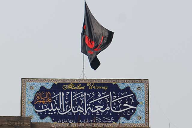 رفع راية الامام الحسين عليه السلام على سارية جامعة أهل البيت عليهم السلام