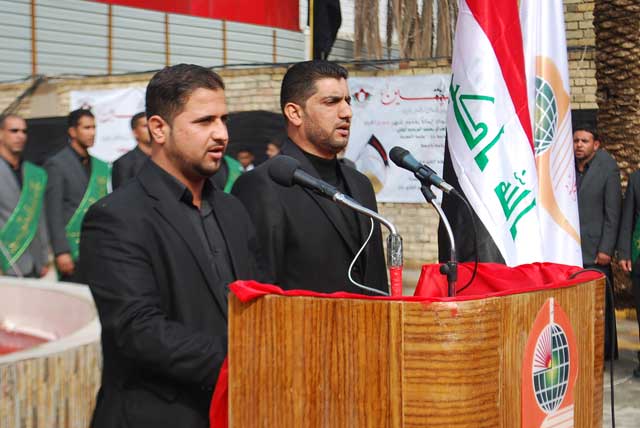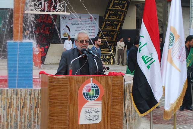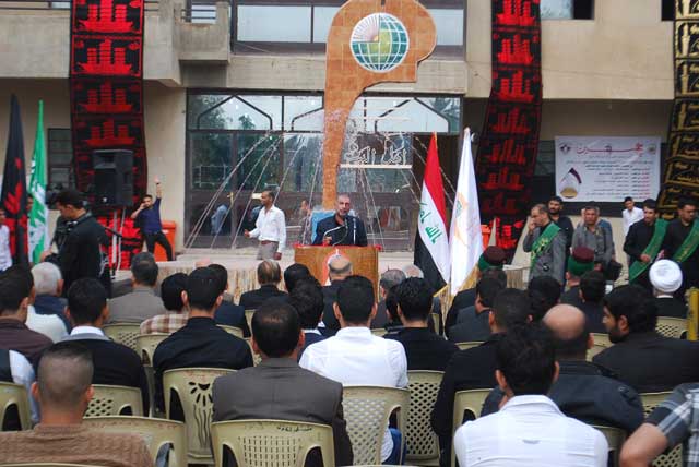 في أجواء مفعمة بالحزن وقلوب حرى وعيون زينتها العبرات لمصاب سيد الشهداء أبي عبد الله الحسين عليه السلام وكما هي الحال في كل عام استقبلت جامعة أهل البيت عليهم السلام متمثلة برئيسها الأستاذ الدكتور صادق عبدالعزيز الموسوي ومؤسسها السيد الدكتور محسن باقر القزويني وعمداء كلياتها ورؤساء الأقسام والأساتذة والطلبة وفد الأمانة العامة للعتبة الحسينية المقدسة إيذاناً ببدأ مراسيم رفع راية الإمام الحسين عليه السلام على سارية جامعة اهل البيت عليهم السلام وقد بدأ الحفل بتلاوة آيات من الذكر الحكيم بعدها ألقى السيد الدكتور محسن القزويني كلمة شكر فيها القائمين على هذه الفعالية لإحياء الشعائر الحسينية المباركة في جامعات العراق كما تطرق في كلمته إلى البعد التاريخي لمعسكري الخير والشر والممتدة آثارهما إلى يومنا هذا حيث معسكر الخير المتمثل بخط ونهج أهل البيت عليهم السلام نهج الصلاح والسلام والمؤاخاة ومعسكر الشر المتمثل بقوى الباطل والارهاب وممارسة شتى أنواع الظلم والاضطهاد للإنسانية أجمع.