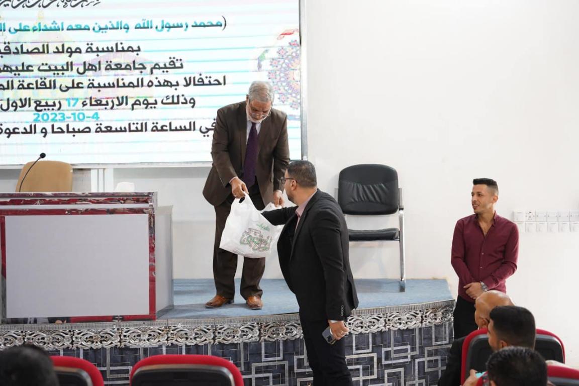 بمناسبة مولد الرسول الاعظم محمد ص اقامت جامعة أهل البيت عليهم السلام حفلا بهيا بالمناسبة البهيجه . واقيم الحفل على القاعة الكبرى في كلية طب الأسنان ،وابتدا الحفل بتلاوة أي من الذكر الحكيم تلاها الطالب محمد جار الله في المرحلة الخامسة طب الاسنان . بعدها وقف الجميع لقراءة سورة الفاتحه على ارواح شهداء الاسلام والعراق كافه،،بعدها ردد الحاضرون النشيد الوطني العراقي . بعدها ألقى الاستاذ الدكتور حميد النجدي رئيس الجامعه كلمة في المناسبة بين خلالها اهمية الاسلام وأصل الاسلام الألهي ومعانيه وكيف ذكر الله سبحانه و تعالى كلمة الاسلام في القرآن الكريم وفي عدة سور ولها عدة معانٍ و علام انزلها ، بعدها القت الطالبه عاتكه حميد من كلية الاداب المرحلة الرابعه قصيدة شعريه فصحى في ذكرى الولادة الميمونه،،ثم شاركت نخبة من الشعراء الشعبيين اعضاء اتحاد شعراء الشعر الشعبي بقصائد واهازيج رائعه الهبت حماس الحاضرين ،،ثم ألقى بعدها الدكتور محسن القزويني مؤسس الجامعه كلمته التي اشار فيها الى اهمية الإلتزام بمبادىء الاسلام الحقيقي التي جاء بها رسول الله محمد ص وكيف عانى ولاقى من الظلم والاضطهاد في سبيل نشر الرساله الالهية المباركة ،،وما يتوجب علينا من التزامات للسير في خطى الرسول الأكرم والائمة الاطهار . بعدها تم عرض مقاطع من فيلم الرساله وقد اجريت على أساس الفيلم مسابقة من خمسة اسئلة وفاز فيها الطالب محمد حسين في المرحلة الخامسة من كلية طب الأسنان ،وسلمه الجائزه الدكتور محسن القزويني وهي عبارة تاب من النوع الممتاز، بعدها توجه السيد رئيس الجامعه بالشكر الجزيل لكل الحاضرين من الضيوف الكرام وعمداء الكليات واساتذة وطلبة الجامعة