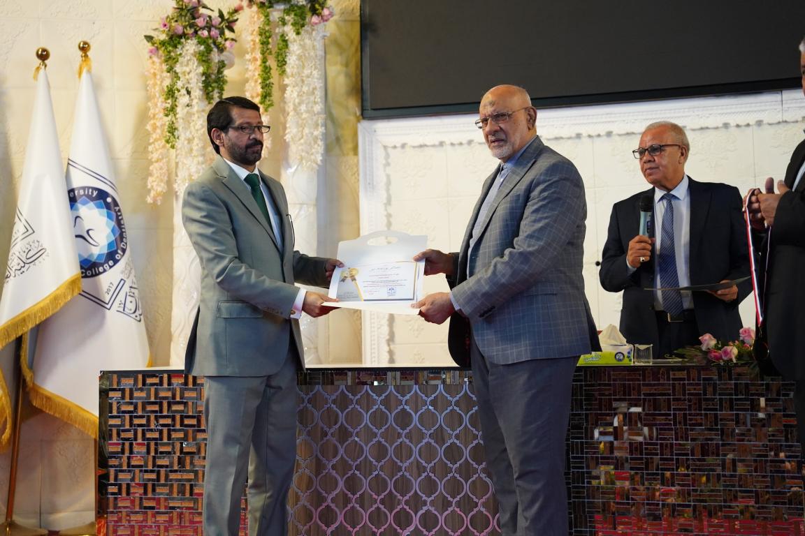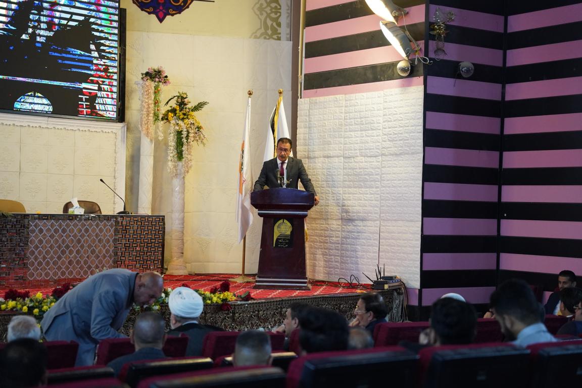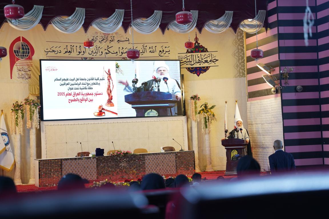 والاستاذ المهندس منتصر الامارة رئيس اتحاد البرلمانيين العراقيين والاستاذ الدكتور حسن الياسري مستشار رئيس الوزراء للشؤون الدستورية والأستاذ الدكتور فراس المسلماوي عضو مجلس النواب ونائب رئيس لجنة التعليم العالي النيابية وعدد كبير من الساده البرلمانيين وعمداء الكليات الاهلية والسيد رئيس جامعة اهل البيت ع الاستاذ الدكتور حميد النجدي والدكتور محسن القزويني مؤسس الجامعه وعمداء كليات الجامعة واساتذتها وطلبتها وابتدا الحفل بالانصات الى ايات بينات من الذكر الحكيم بعدها وقف الحاضرون لقراءة سورة المباركه الفاتحة على ارواح شهداء العالم الاسلامي وشهداء غزة والعراق ،،ثم ردد الجميع النشيد الوطني العراقي بعدها استمع الواقفون الى النشيد الوطني الفلسطيني ثم القى الدكتور محسن القزويني كلمة اشاد فيها بالمقاومة الباسلة وما يتعرض له اهل غزة من ابادة جماعية ثم اسهب بالحديث عن الظروف الصعبة التي كتب فيها الدستور العراقي في مرحلة اراد فيها الاعداء ان يبقى العراق تحت وطٱة وظلم الارهاب ،،وكيف قدم اعضاء الجمعية الوطنية انذاك نخبة خيرة من الشهداء الابرار فقط سبيل اتمام كتابة الدستور ،،كما تحدث عن الايجابيات والسلبيات التي شابت الدستور العراقي والتي نجمت عن عدم تطبيق بعض الفقرات المهمه وفيه وتهميش البعض الاخر