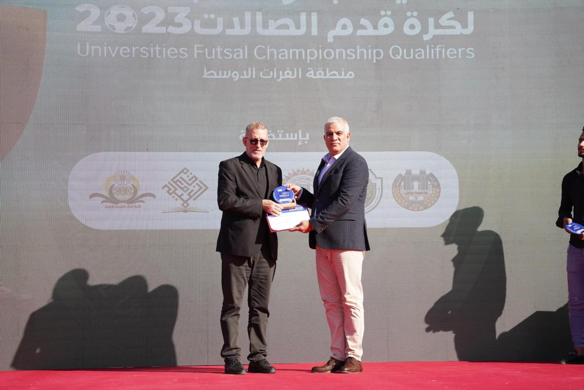 شارك وفد جامعة في حفل اختتام بطولة الجامعات العراقية لكرة الصالات لمنطقة الفرات الأوسط حيث حضر الوفد المباراة النهائية للبطولة والتي أسفرت عن فوز جامعة كربلاء باللقب على حساب الجامعة الاسلامية بفارق ضربات الجزاء لينتقل بعد ذلك الحضور إلى مراسيم اختتام البطولة حيث تسلم الاستاذ حيدر المعمار رئيس الوفد درع وشهادة المشاركة في البطولة وتسلم كل من مدرب فريق الجامعة م.م ميثم داعي الحق و مساعد المدرب م.م أسامه خيري درع اللعب النظيف لفريق الجامعة