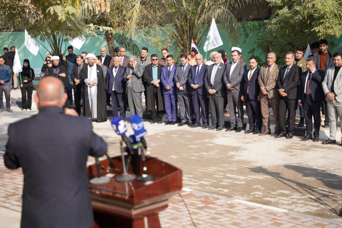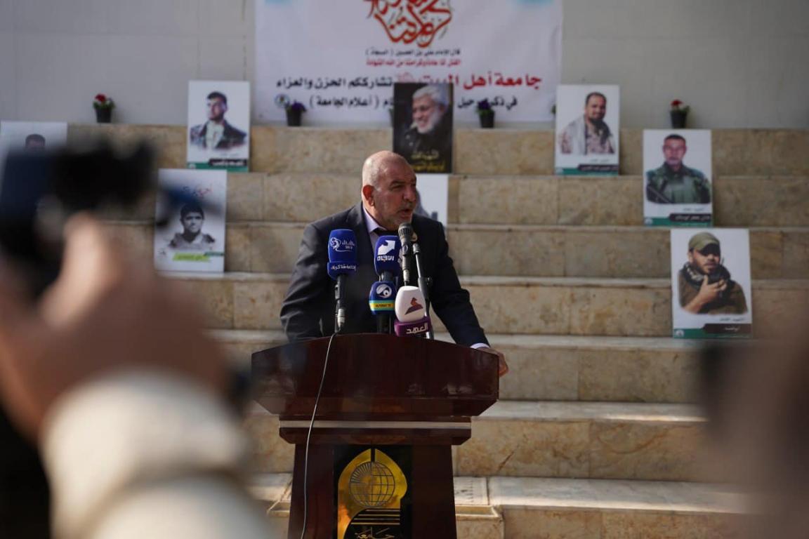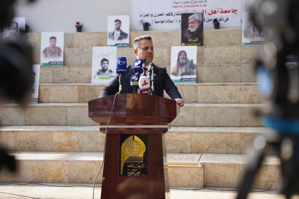 احتفت جامعة اهل البيت ع بذكرى استشهاد القائدين الهمامين ,( الشهيد القائد ابو مهدي المهندس وضيف العراق الشهيد القائد قاسم سليماني ،اللذين اغتيلا غدرا وبهتانا،،حيث اقامت وقفة تأبينية استذكارا لذلك اليوم الذي فجعت فيه الامة الاسلامية اجمع عندما طالتهم صواريخ الغدر الامريكية الصهيونيه،،وابتدا الحفل بقراءة سورة الفاتحة المباركه على ارواح شهداء الاسلام وشهداء العراق كافه ثم قرأ بعدها الاستاذ صادق القزويني مدير الاعلام ابياتا من الشعر استوحاها من واقعة الطف الاليمة ومن مواقف وبطولة اولاد الحسين ع وصحبه الابرار ،،بعدها القى السيد رئيس الجامعة الاستاذ الدكتور حميد النجدي كلمة فضح فيها الجرائم التي يقوم بها العدو الصهيوني الغاشم في غزة الصمود وكيف ارتكب ابشع صور القتل ولم يستثن كهلا ولا عجوزا ولا امرأة ولا طفلا من صواريخه الحقوده وقنابله الاثمة التي طالت الارض والحرث ودمرت كل ما هو حي ،وفي نفس الوقت لم نسمع من الحكام العرب سوى استنكارات خجولة وجبانه ولم يقف احد من العرب وقفة جادة لردع الغزاة سوى ابناء المقاومه من العراق العظيم ،،كما تحدث عن المخططات الامريكية الصهيونيه التي تريد بالعالم الاسلامي الذل والخنوع من خلال اغتيال قادة النصر الابرار وما هم سوى رجال مدافعين عن الارض والعرض والمقدسات ،ضد عدو غاشم محتل غاصب اتى من اقاصي البحار لاذلال العراقين الاحرار ولدعم الدواعش الانذال الذين عاثوا في الارض فسادا، ولولا وقفة المجاهدين الابطال من خلال تلبيتهم لنداء المرجعية الرشيده ،،لكان العراق قد استبيح من اقصاه الى اقصاه،،ثم القى بعدها الدكتور سعد السعدي مدير العلاقات في الجامعة كلمة اثنى فيها على المقاومين من ابطال الحشد الشعبي وكل من تصدى ولم يزل يتصدى للقوى الامريكيه الصهيونية واذنابهم من العملاء الخونه ،وضرورة تفعيل القوانين في مجلس النواب التي من شانها المحافظة على حرية العراق وكرامته وقدسية ارضه بالتعجيل في تفعيل الفقرات التي تخص طرد المحتل وعدم السماح لاية قوة اجنبية غاشمة في العمل في العراق ،ثم اختتم الاستاذ صادق القزويني مدير اعلام الجامعة الوقفة التأبينية بقراءة ابيات من الشعر العربي بعدها اعاد الحاضرون قراءة سورة المباركة الفاتحة مرة اخرى على روحي الشهيدين السعيدين وشهداء الاسلام كافة