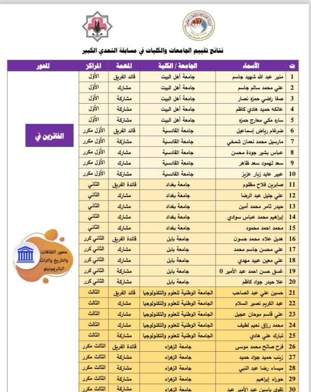 فريق جامعة اهل البيت عليهم السلام يحرز المركز الاول في مسابقة التحدي الكبير على مستوى الجامعات والكليات الحكومية والأهلية ضمن محور( الثقافات والتاريخ والتراث الباتريمونيتو )علما بان الفريق مكون من كل من