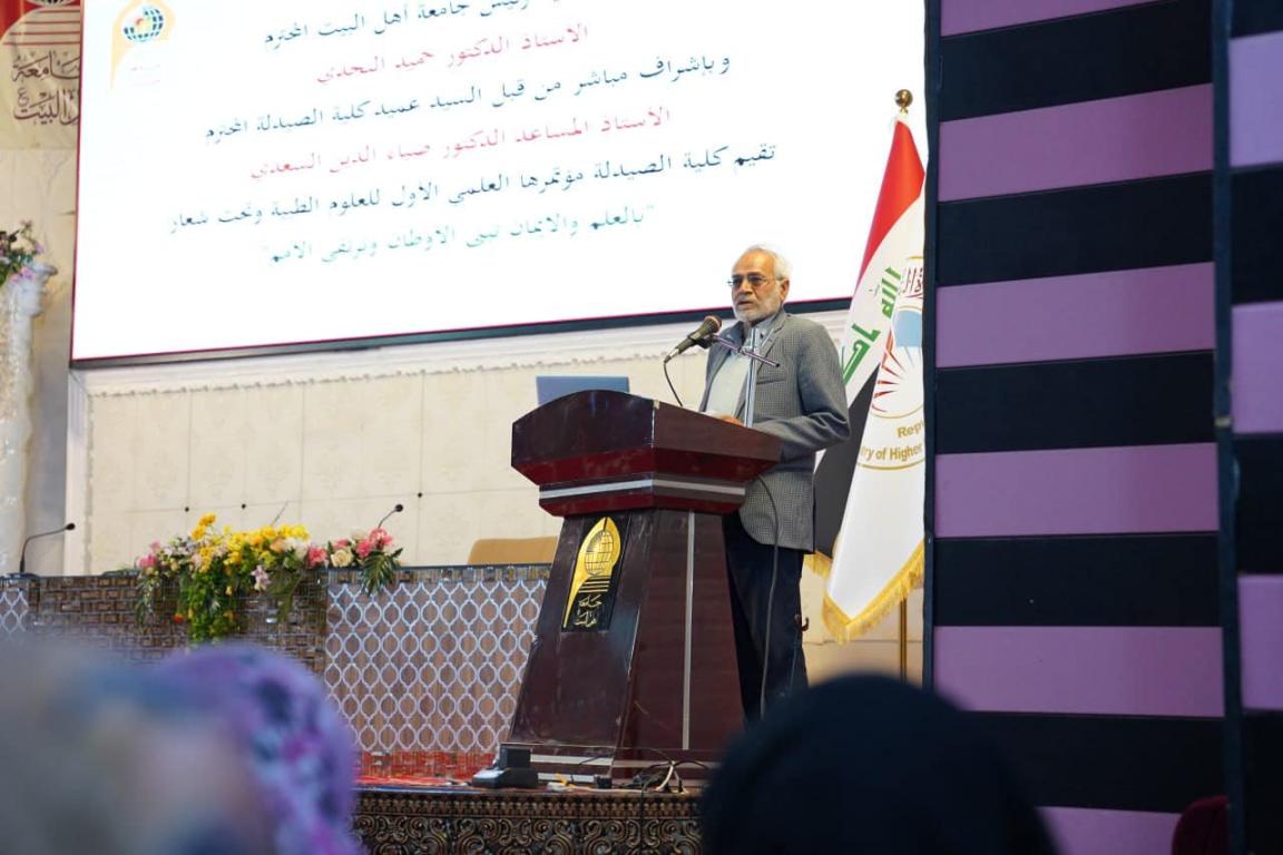 برعاية من السيد رئيس جامعة أهل البيت (عليهم السلام)وبإشراف مباشر من قبل السيد عميد كلية الصيدلة المحترم الاستاذ المساعد الدكتور ضياء الدين السعدي أقامت كلية الصيدلة افتتاحية مؤتمرها العلمي الاول للعلوم الطبية تحت شعار (بالعلم و الايمان و الاخلاق تبنى الاوطان و ترتقي الامم ) على قاعة مسرح الجامعة و حضر الافتتاح السيد مؤسس الجامعة الدكتور محسن القزويني والسيد مساعد رئيس الجامعة الاستاذ الدكتور باسم العقابي و السادة عمداء الكليات و معاونيهم حيث استهل المؤتمر قراءة اي من الذكر الحكيم و الاستماع للنشيد الوطني العراقي و قراءة سورة المباركة الفاتحة على ارواح الشهداء الابرار ثم ارتقى المنصة السيد مؤسس الجامعة السيد محسن القزويني الذي رحب بالحضور ومن ثم محاضرات علمية للسيد مدير التفتيش والشكاوي والسيد نقيب صيادلة كربلاء القدسة والسيد عميد كلية الصيدلة بعدها تم تكريم السادة الضيوف