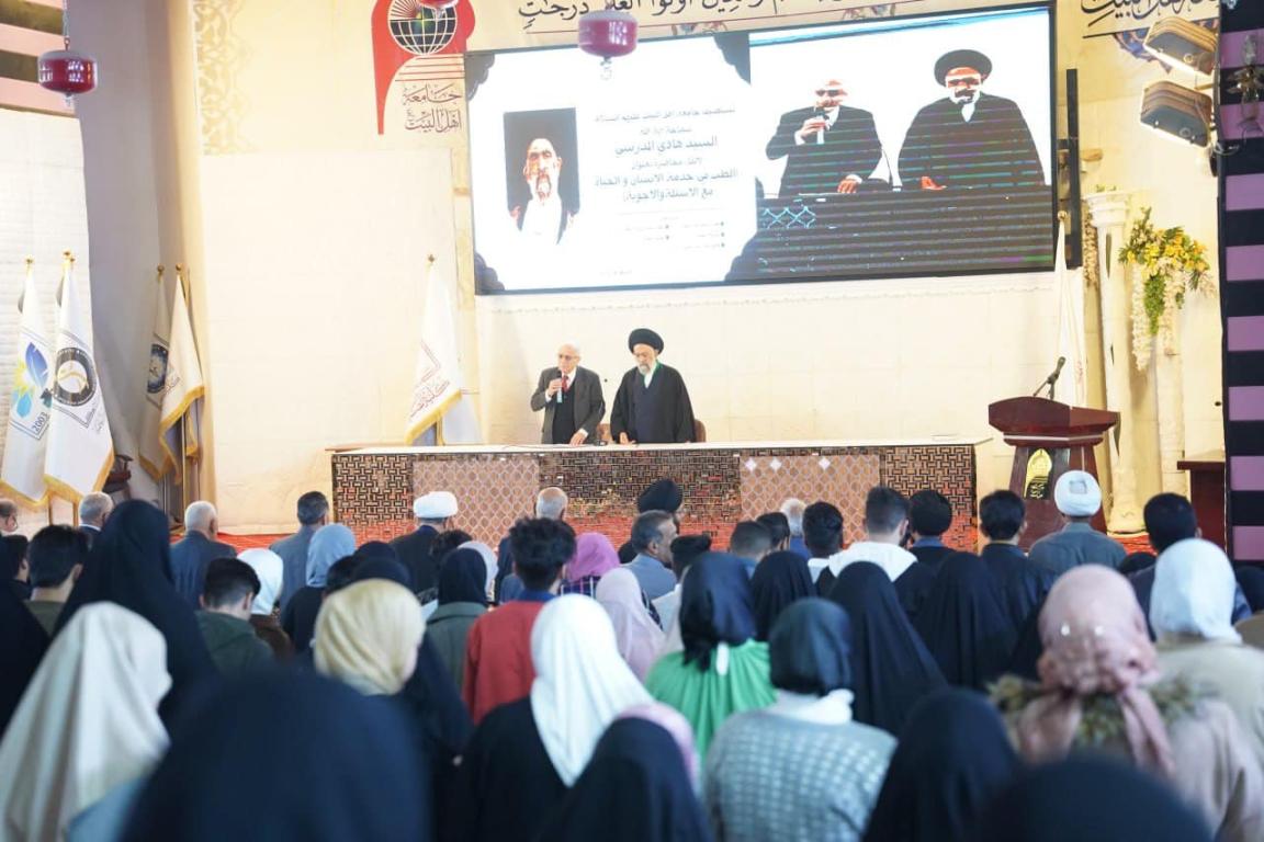 زار اليوم الأربعاء ٦- ١٢ - ٢٠٢٣ سماحة العلامة الاديب اية الله السيد هادي المدرسي جامعة اهل البيت عليهم السلام وكان في استقباله كلا من مؤسس الجامعة و رئيسها واستاذة كلية الصيدلة، و القى على طلبة المرحلة الأولى من طلبة كلية الصيدلة محاضرة حول الطب في خدمة الإنسان و الحياة تحدث فيها عن مسؤلية الأطباء والصيادلة؛ منها؛ ضرورة تحلي هذا الصنف من الشخصيات بالتواضع والعطاء و الرحمة على الطبقات المحرمة والمسحوقة.