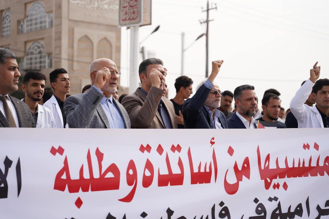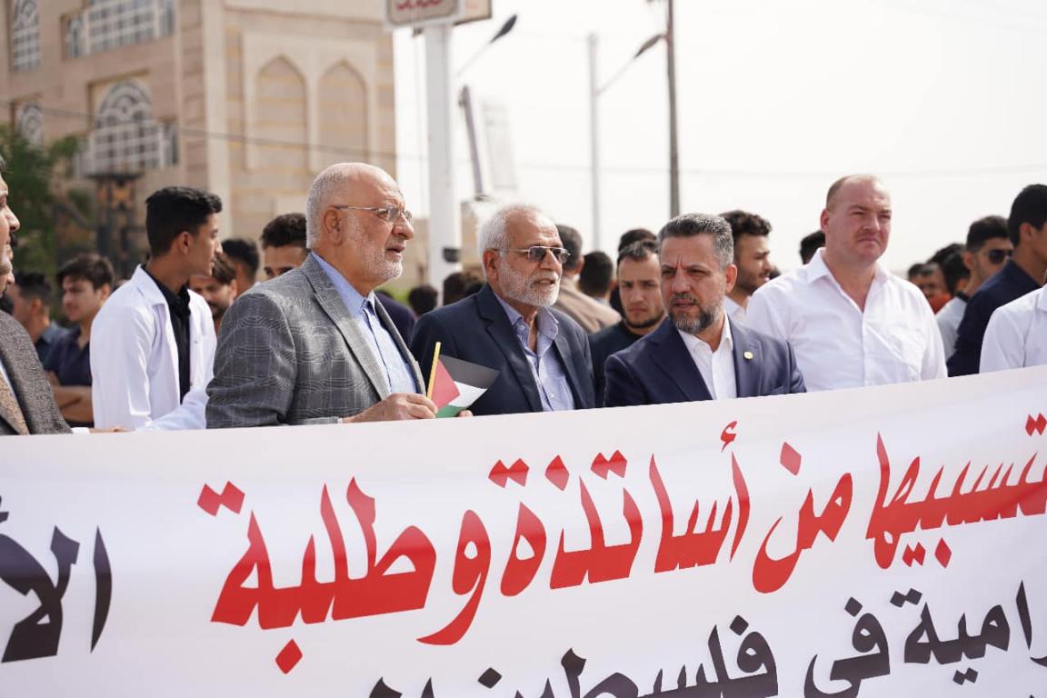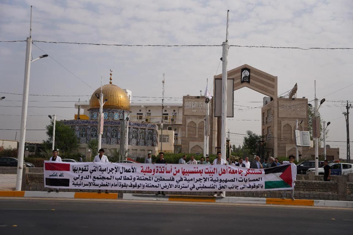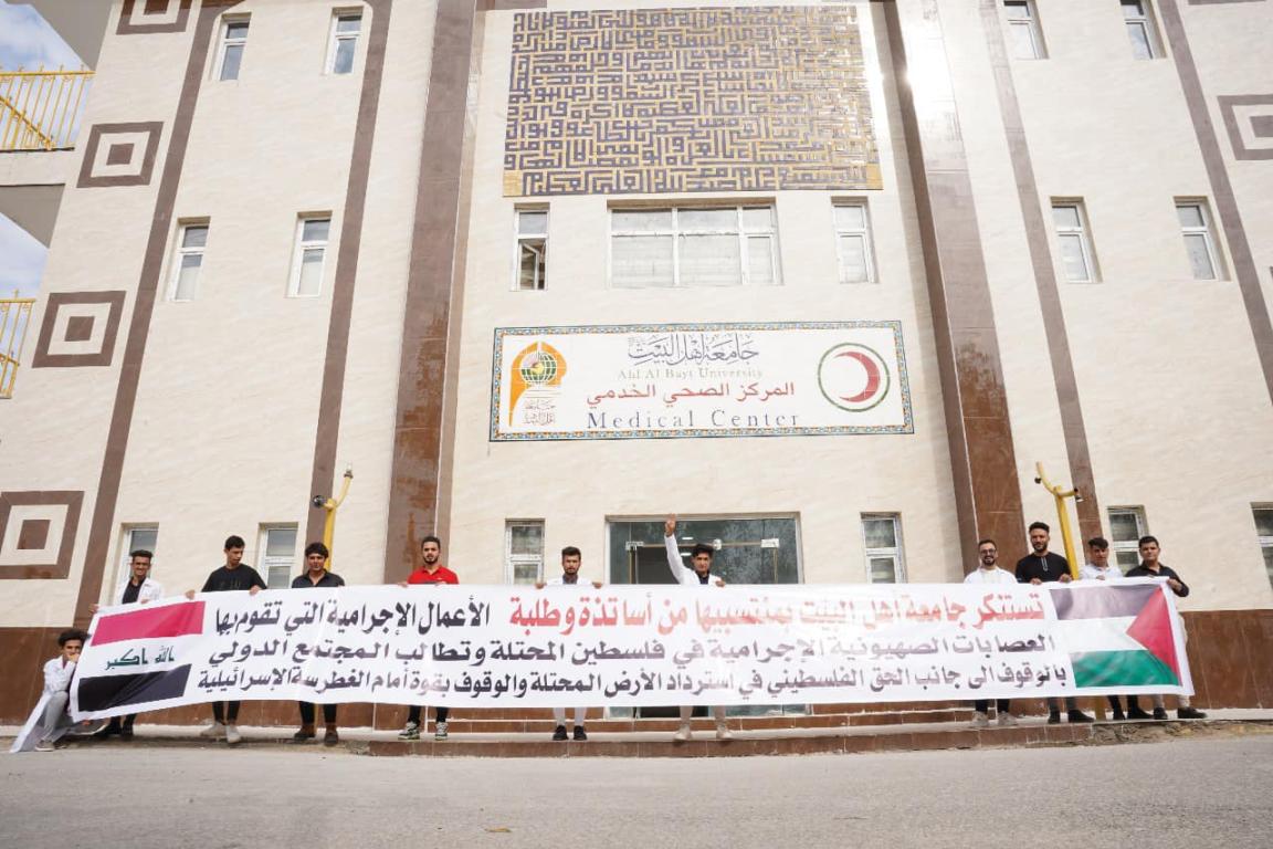 تضامنا مع اهلنا في فلسطين المحتلة قام اساتذة و طلبة جامعة اهل البيت عليهم السلام وقفة احتجاجية ضد العدوان الاسرائيلي وقد شارك في الاحتجاج جمع من قيادات الجامعة موسس ورئيس الجامعة