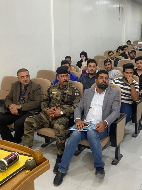 بحضور السيد مساعد رئيس الجامعة للشؤون الادارية الاستاذ الدكتور باسم العقابي والسيد مدير قسم مكافحة المتفجرات في محافظة كربلاء العميد علي عبد الجليل الساعدي والاستاذ حيدر حسن جواد مدير قسم المتابعة في الجامعة اقيمت محاضرة توعوية لطلبة كلية طب الاسنان عن مخاطر المتفجرات وشارك في تقديم المحاضرة المقدم اكرم محسن الغانمي والمفوض المعالج حسين سلمان والمفوض المعالج سعد جواد والمفوض المعالج مكي رزاق والاستاذ جاسم محمد الحاتمي مع مجموعة من اساتذة وطلبة كلية طب الاسنان