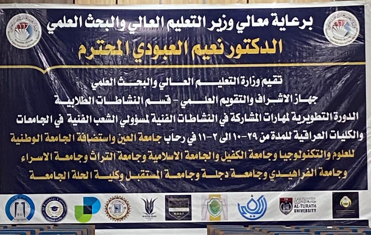 برعاية معالي وزير التعليم العالي والبحث العلمي الدكتور نعيم العبودي تم افتتاح دورة تطوير مهارات المشاركة في النشاطات الفنية باشراف قسم النشاطات الطلابيه في جهاز الاشراف والتقويم العلمي في وزارة التعليم العالي والبحث العلمي و باستضافة جامعة العين في محافظة ذي قار مع نخبة من الجامعات والكليات الحكوميه والاهلية وبمشاركة اكثر من سبعين ممثلا لاقسام النشاطات الطلابيه في الجامعات والكليات الحكوميه والاهلية …