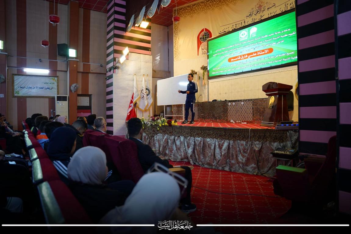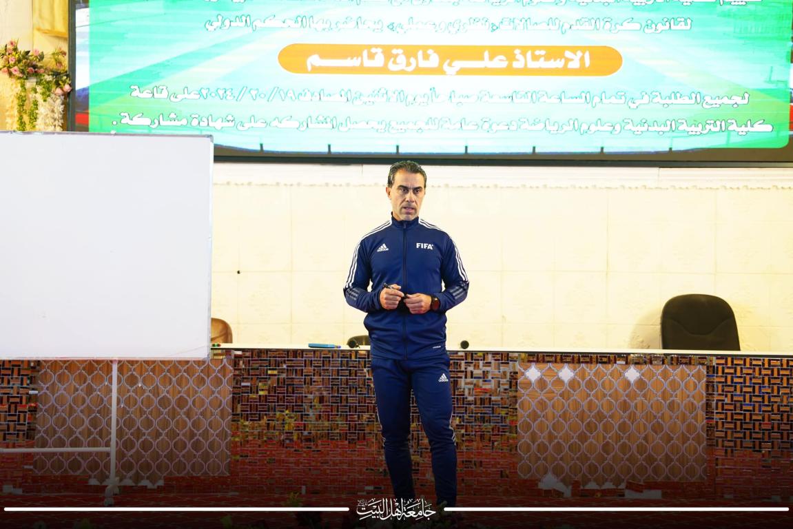 نظمت كلية التربية البدنية وعلوم الرياضة في الجامعة و بالتعاون مع قسم النشاطات الطلابية محاضره علمية بعنوان( التطورات الحديثة في قانون كرة القدم للصالات ) حاضر فيها الحكم الدولي الاستاذ علي فاروق قاسم ، وبحضور عميد كلية التربية البدنية وعلوم الرياضة الاستاذ الدكتور رابحه الرماحي و بمشاركة نخبة من اساتذة الكلية وحضور الاستاذ حيدر المعمار مدير قسم النشاطات الطلابية وطلبة الجامعة من مختلف الكليات على القاعة المركزية في الجامعة