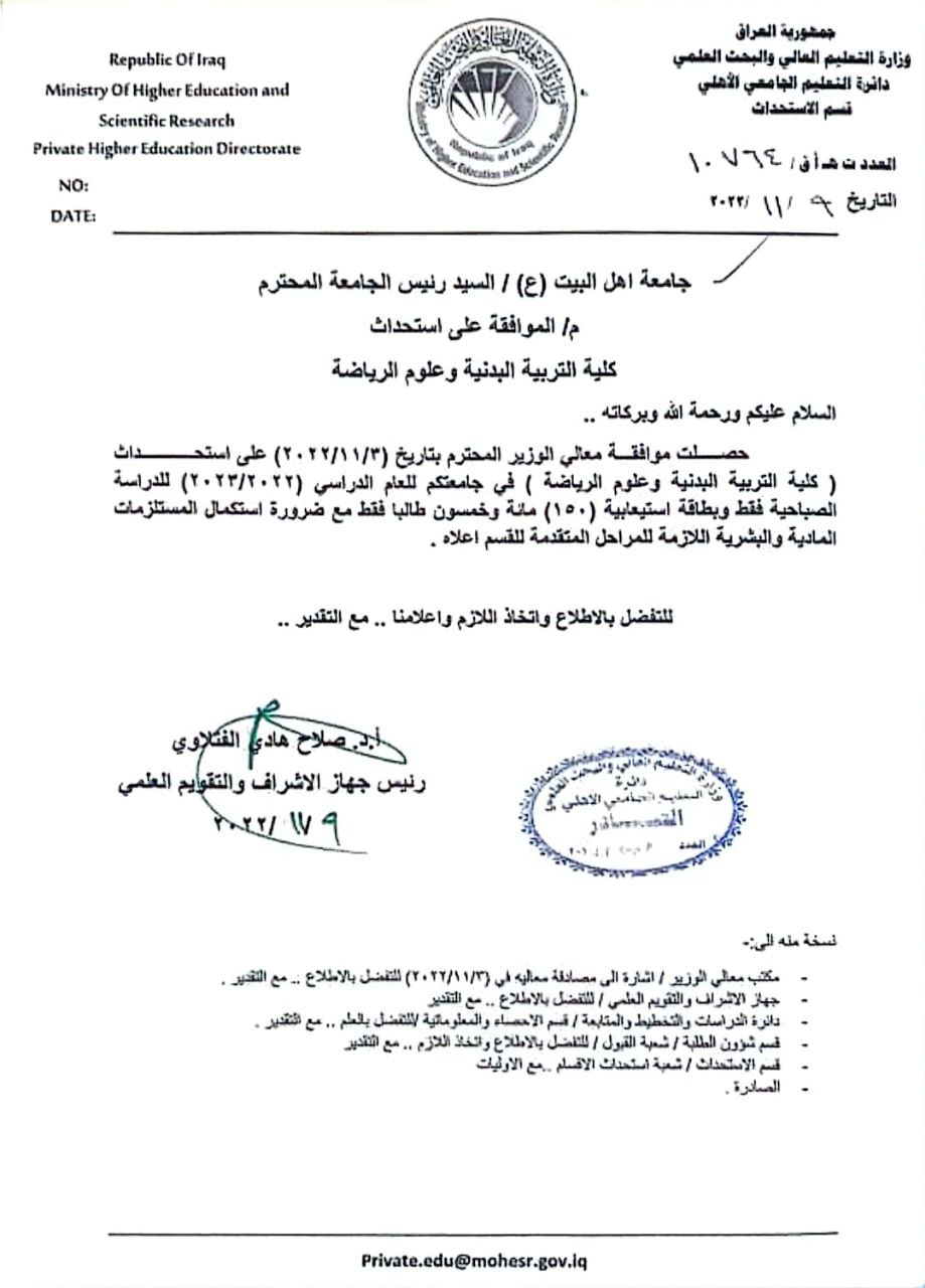 تم استحداث كلية التربية البدنية وعلوم الرياضة في جامعة أهل البيت عليهم السلام بموافقة معالي وزير التعليم العالي والبحث العلمي بتاريخ 3/11/2022
